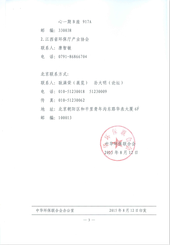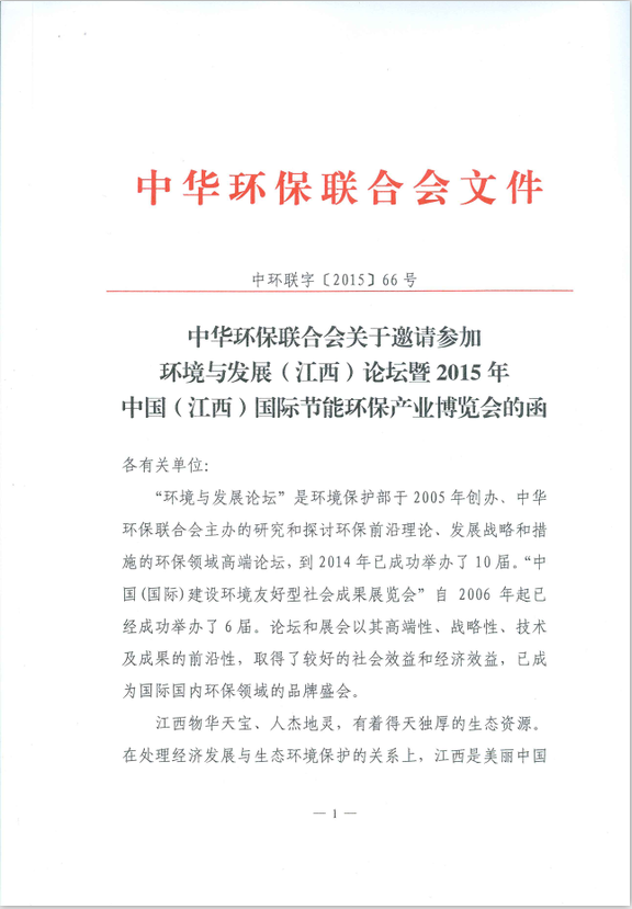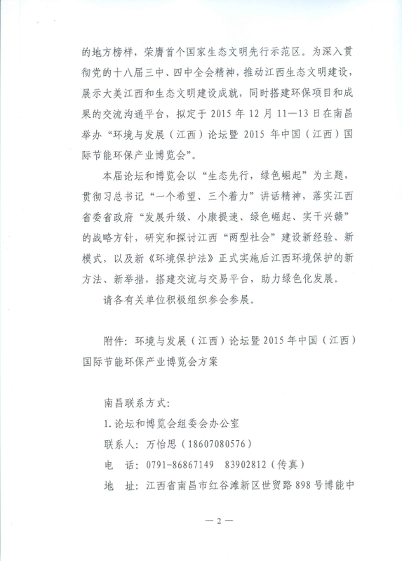 关于邀请参加环境与发展(江西)论坛暨 2015年中国(江西)国际节能环保产业博览会的函