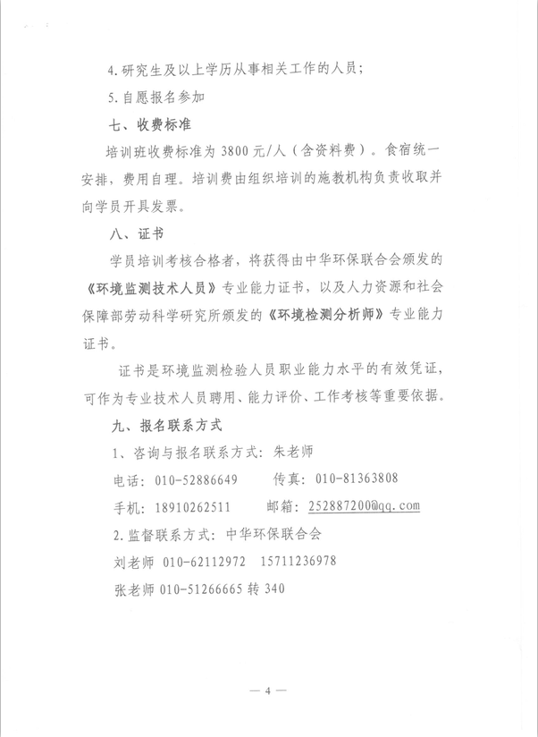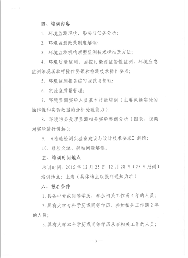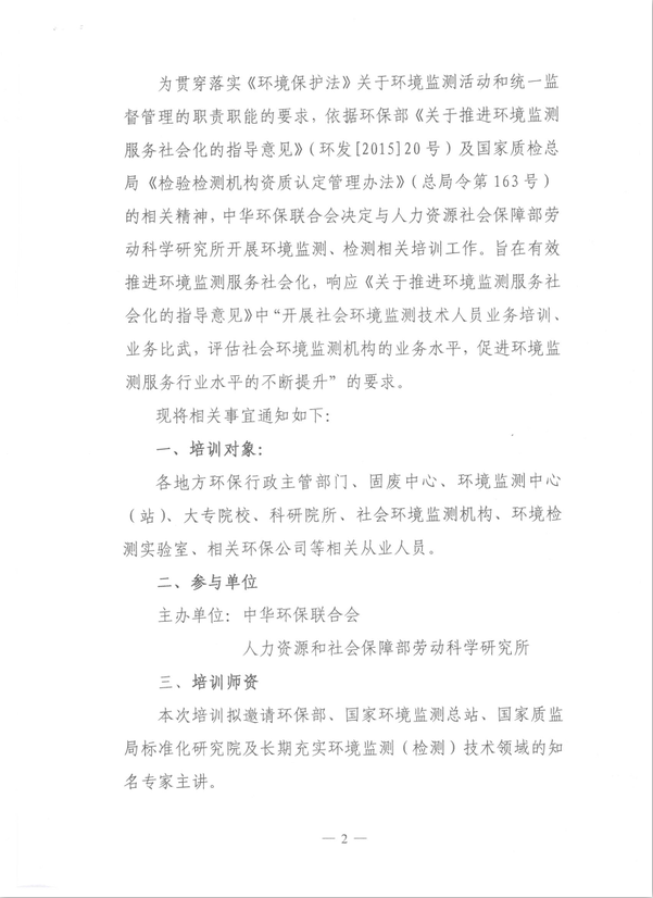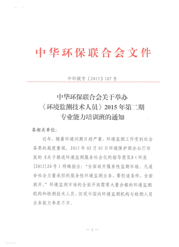 中华环保联合会关于举办《环境监测技术人员》2015年第二期专业能力培训班的通知