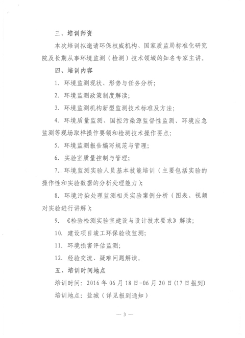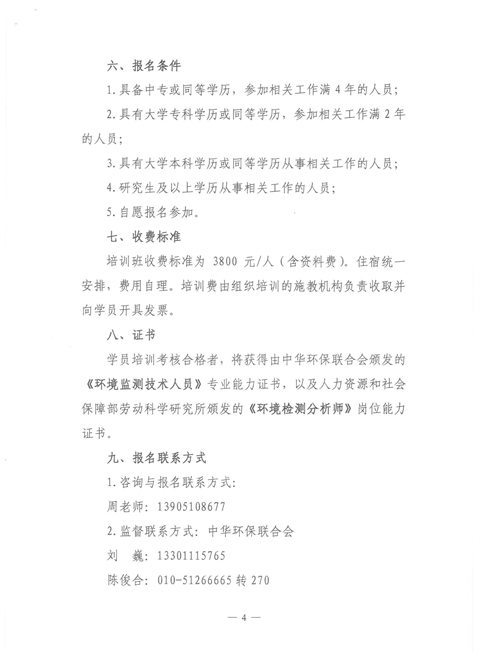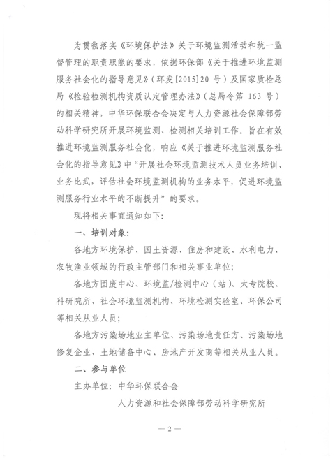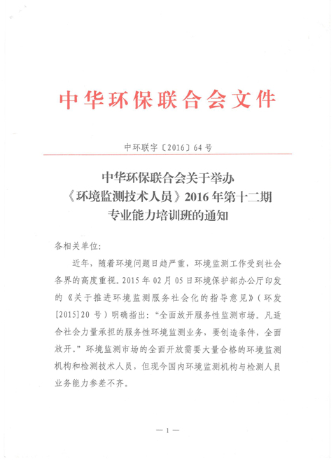 中华环保联合会关于举办《环境监测技术人员》2016年第十二期专业能力培训班的通知