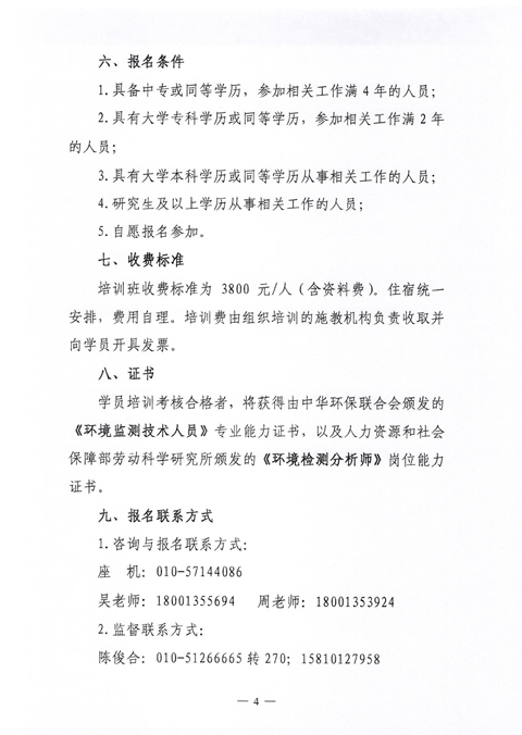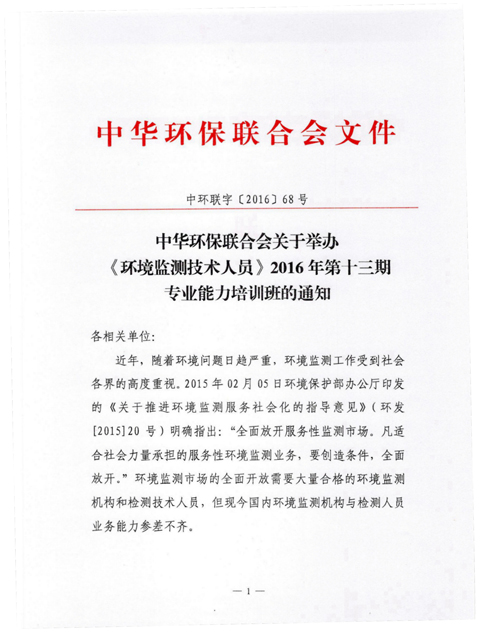中华环保联合会关于举办《环境监测技术人员》2016年第十三期专业能力培训班的通知
