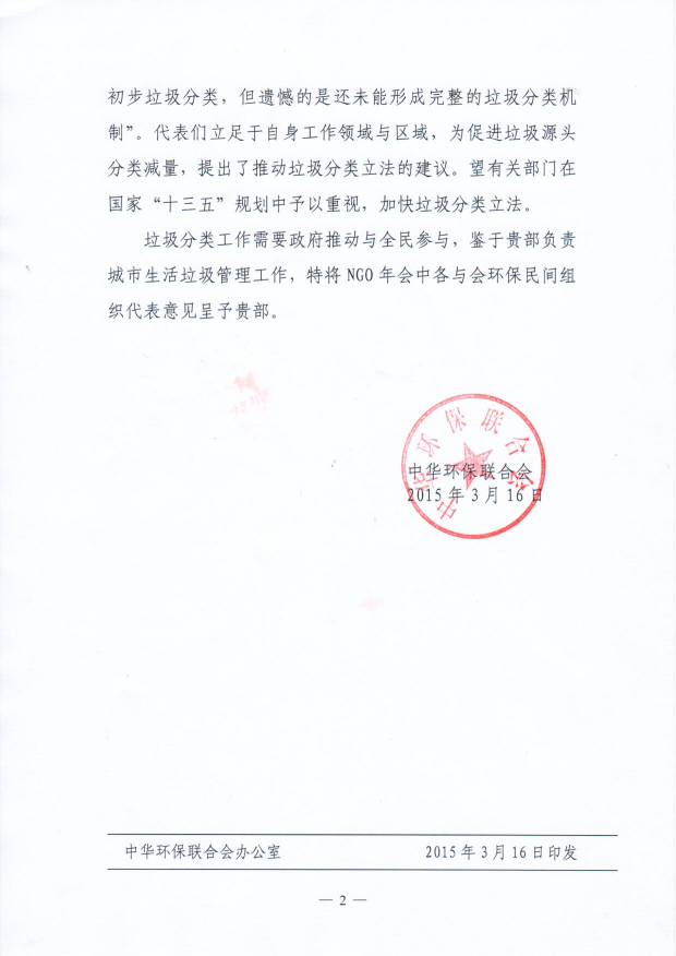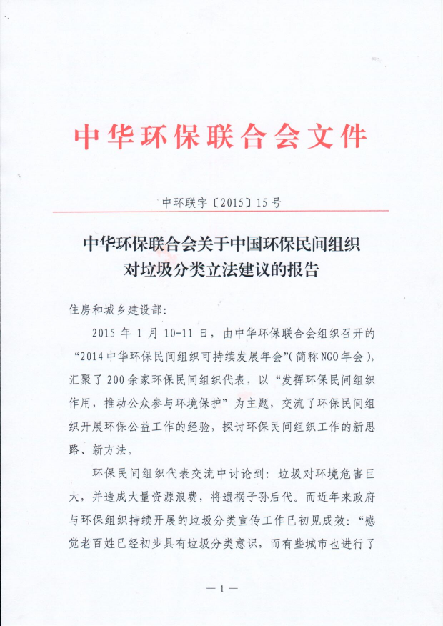 2015年1月10日,在我会组织召开的 “2014中华环保民间组织可持续发展年会”(简称年会)中,200余家环保民间组织的参会代表围绕“为国家‘十三五’环境保护规划建言献策”进行了热烈的交流讨论,代表们提出了建立垃圾分类制度的建议。年会后,我会向国家住房和城乡建设部提交《中华环保联合会关于中国环保民间组织对垃圾分类立法建议的报告》。