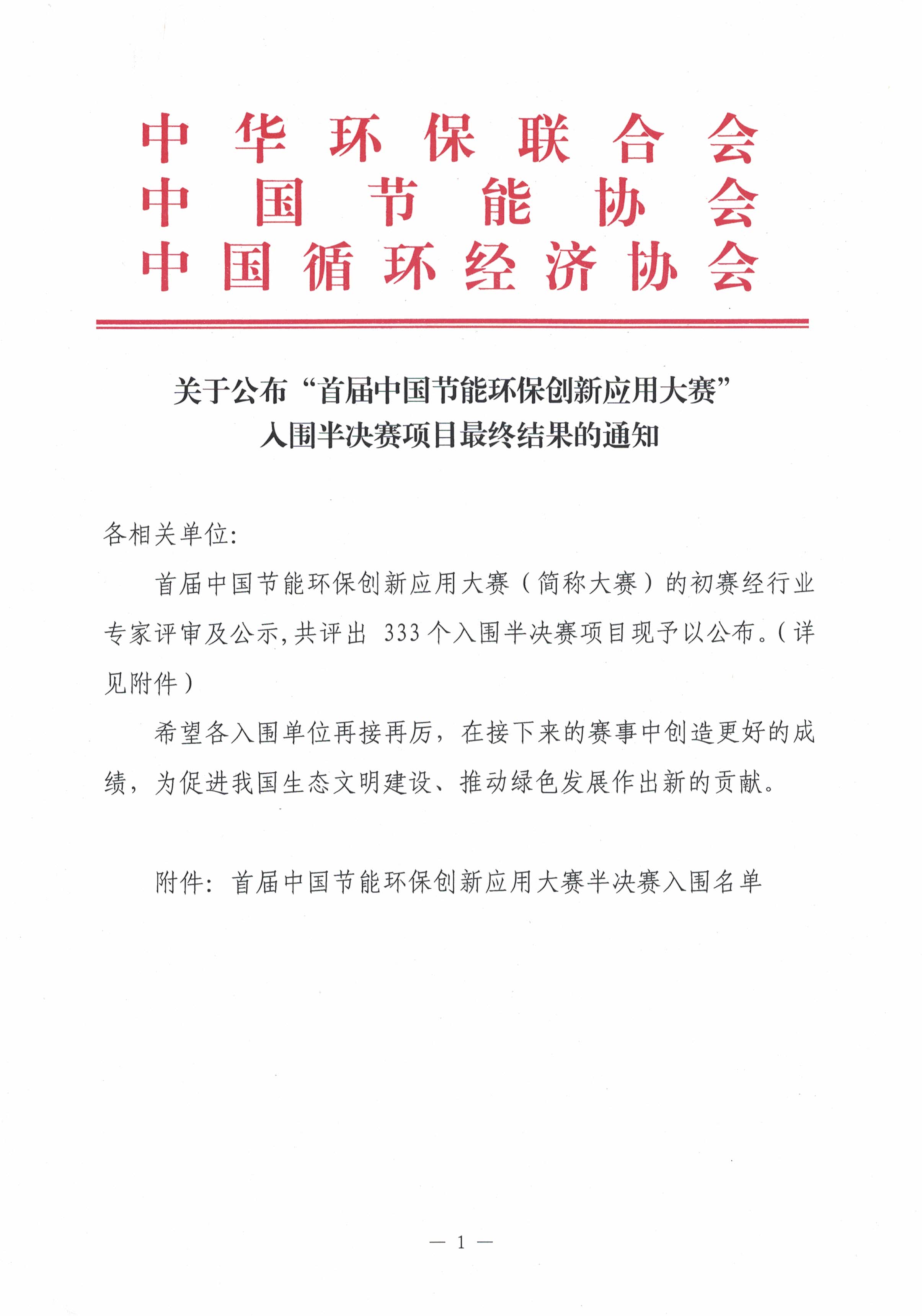 关于公布“首届中国节能环保创新应用大赛”入围半决赛项目最终结果的通知