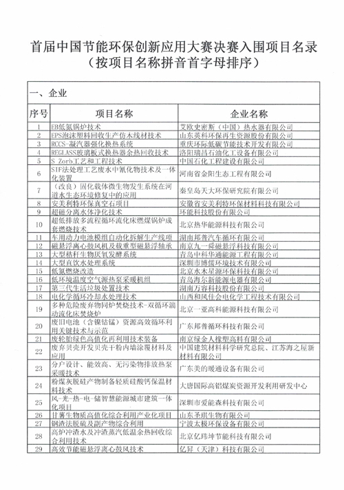 首届中国节能环保创新应用大赛决赛入围项目名录如下: