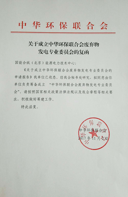 关于成立中华环保联合会废弃物发电专业委员会的复函