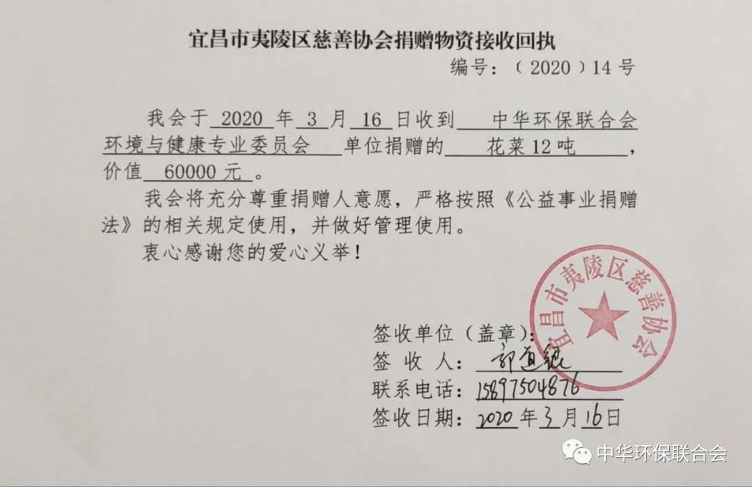 3月16日下午,中华环保联合会环境与健康专业委员会、中国军转民国防科技成果转化中心携手援助抗击新冠肺炎疫情的12吨花菜从上海送达宜昌夷陵区。这批蔬菜由联合会环境与健康专业委员会委员单位上海渔越水产养殖专业合作社捐赠,价值6万元。