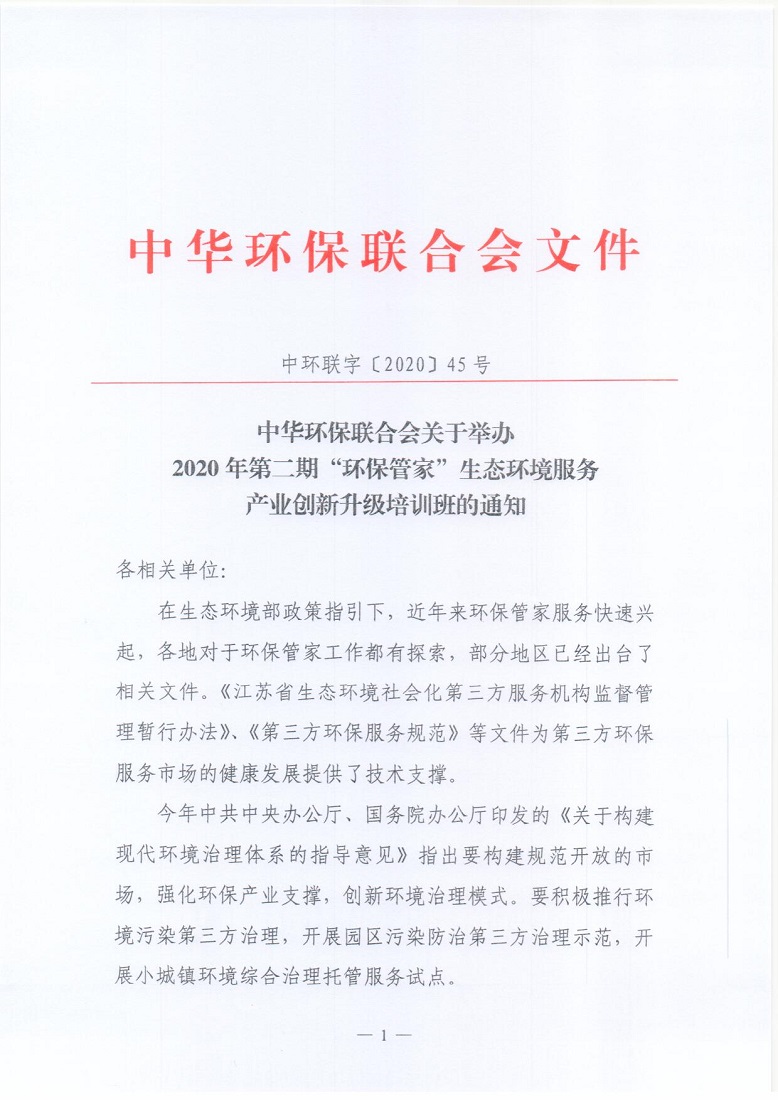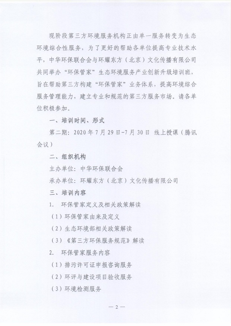 关于举办2020年第二期“环保管家”生态环境服务产业创新升级培训班的通知