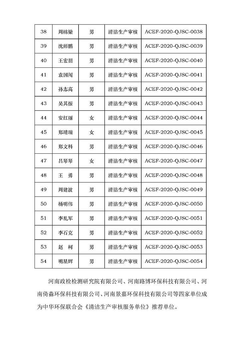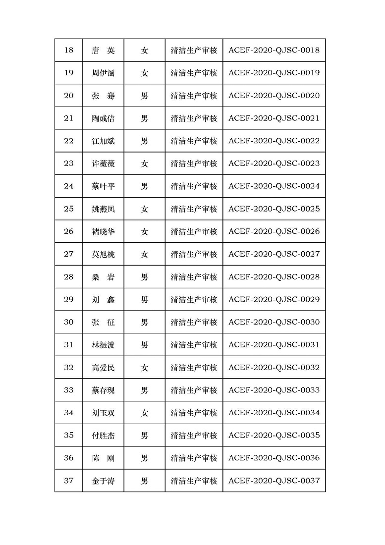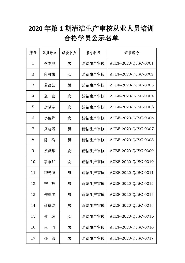 2020年第1期清洁生产审核从业人员培训合格学员公示名单