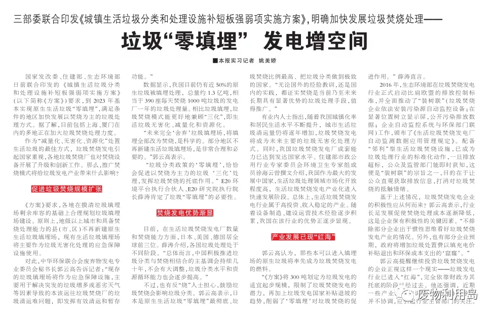 “垃圾分类政策的‘零填埋’,恰恰会促进以焚烧为主力的垃圾‘三化’处理,发挥垃圾焚烧的托底作用。” E20环境平台执行合伙人、E20研究院执行院长薛涛肯定了垃圾“零填埋”的必要性。