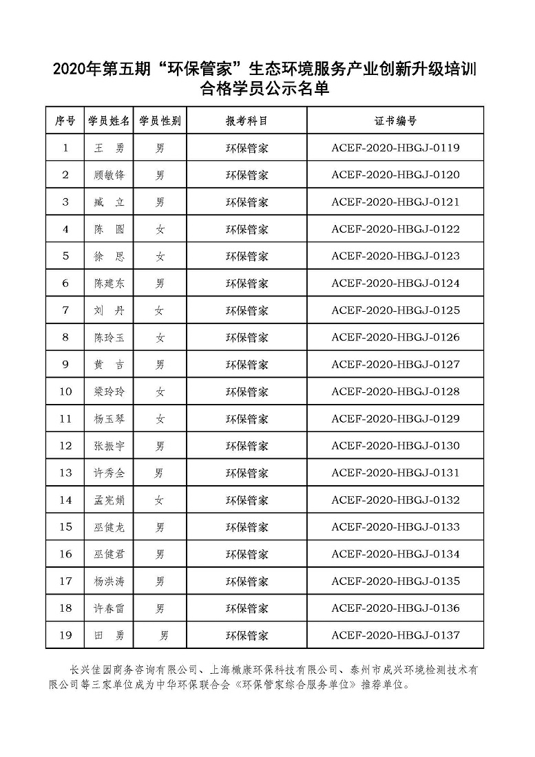 2020年第五期“环保管家”生态环境服务产业创新升级培训合格学员公示名单