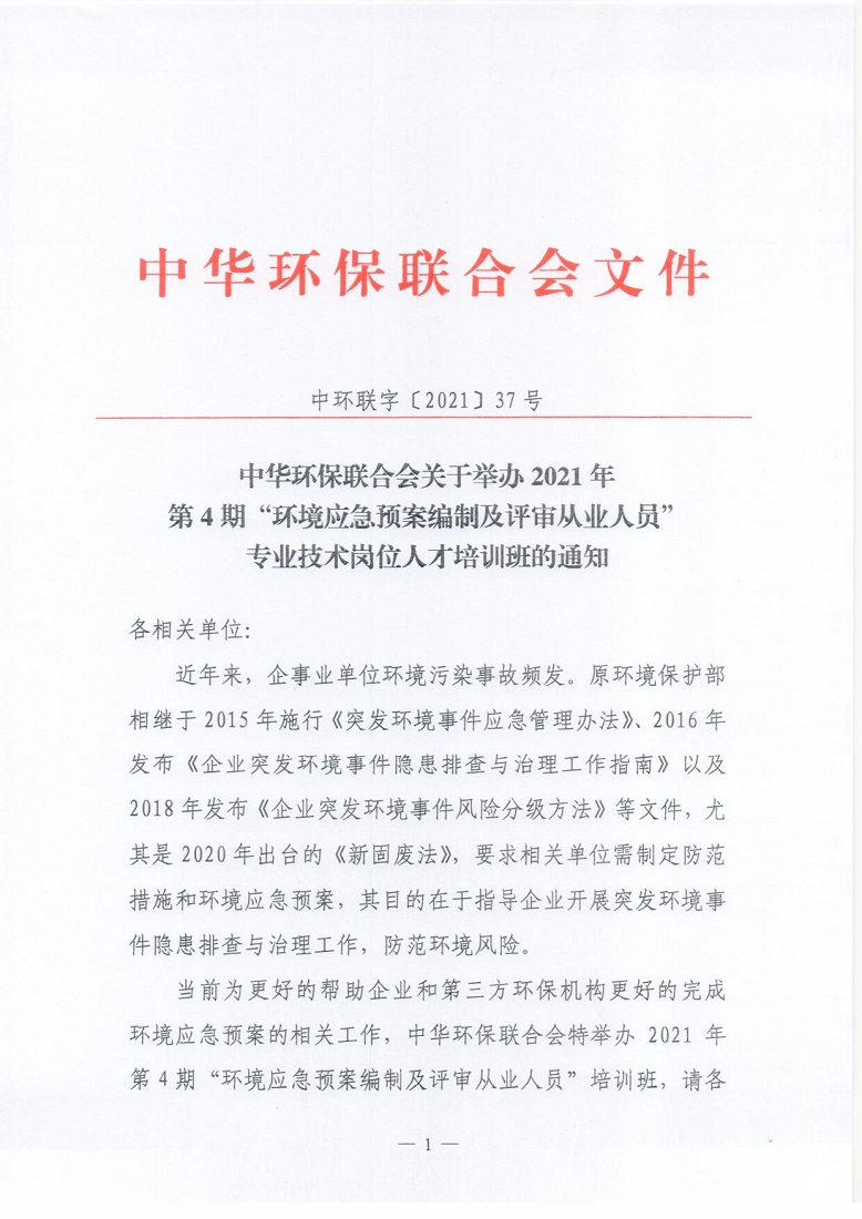 关于举办2021年第4期“环境应急预案编制及评审从业人员”专业技术岗位人才培训班的通知