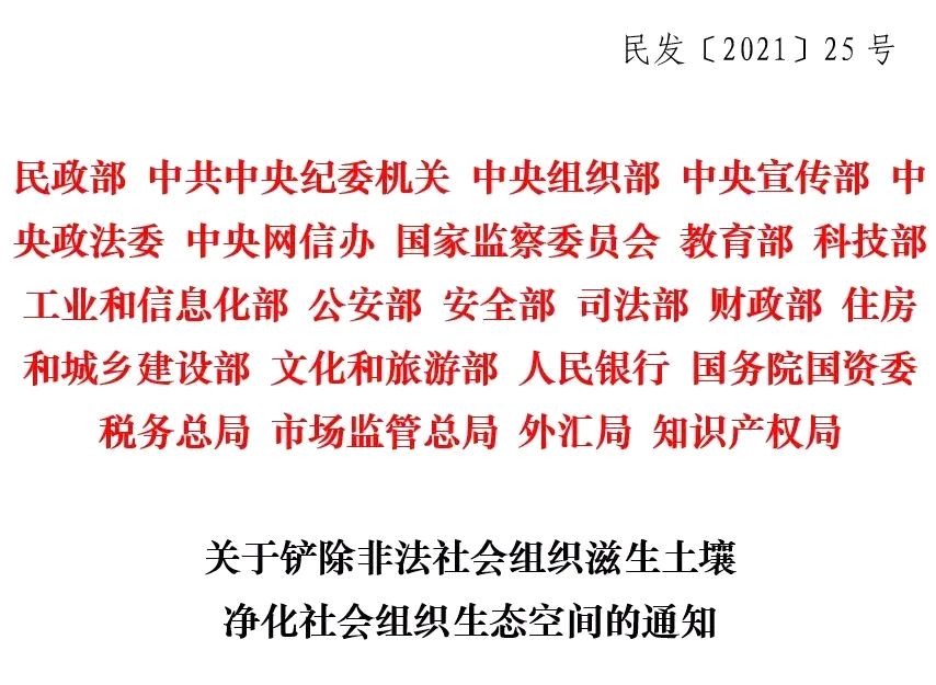 3月20日,民政部等22部门联合印发《关于铲除非法社会组织滋生土壤净化社会组织生态空间的通知》,提出了“六个不得一个提高”七项要求,中华环保联合会积极响应通知,现发出以下倡议: