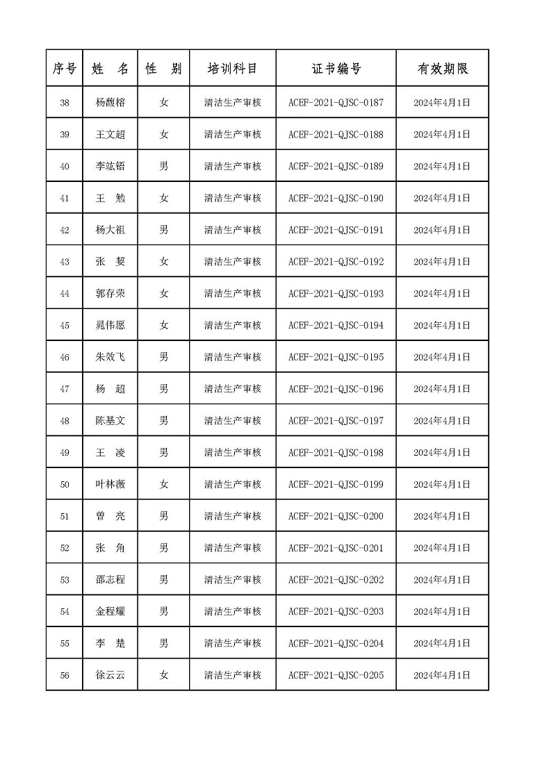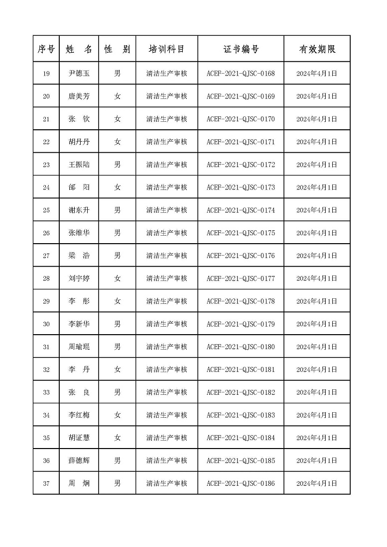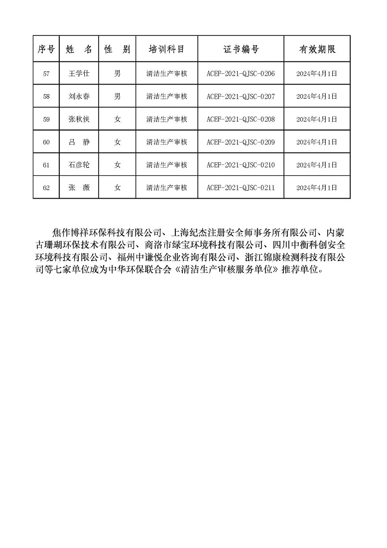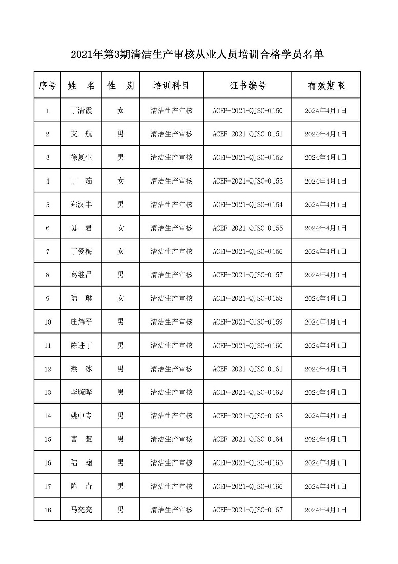 2021年第3期清洁生产审核从业人员培训合格学员名单