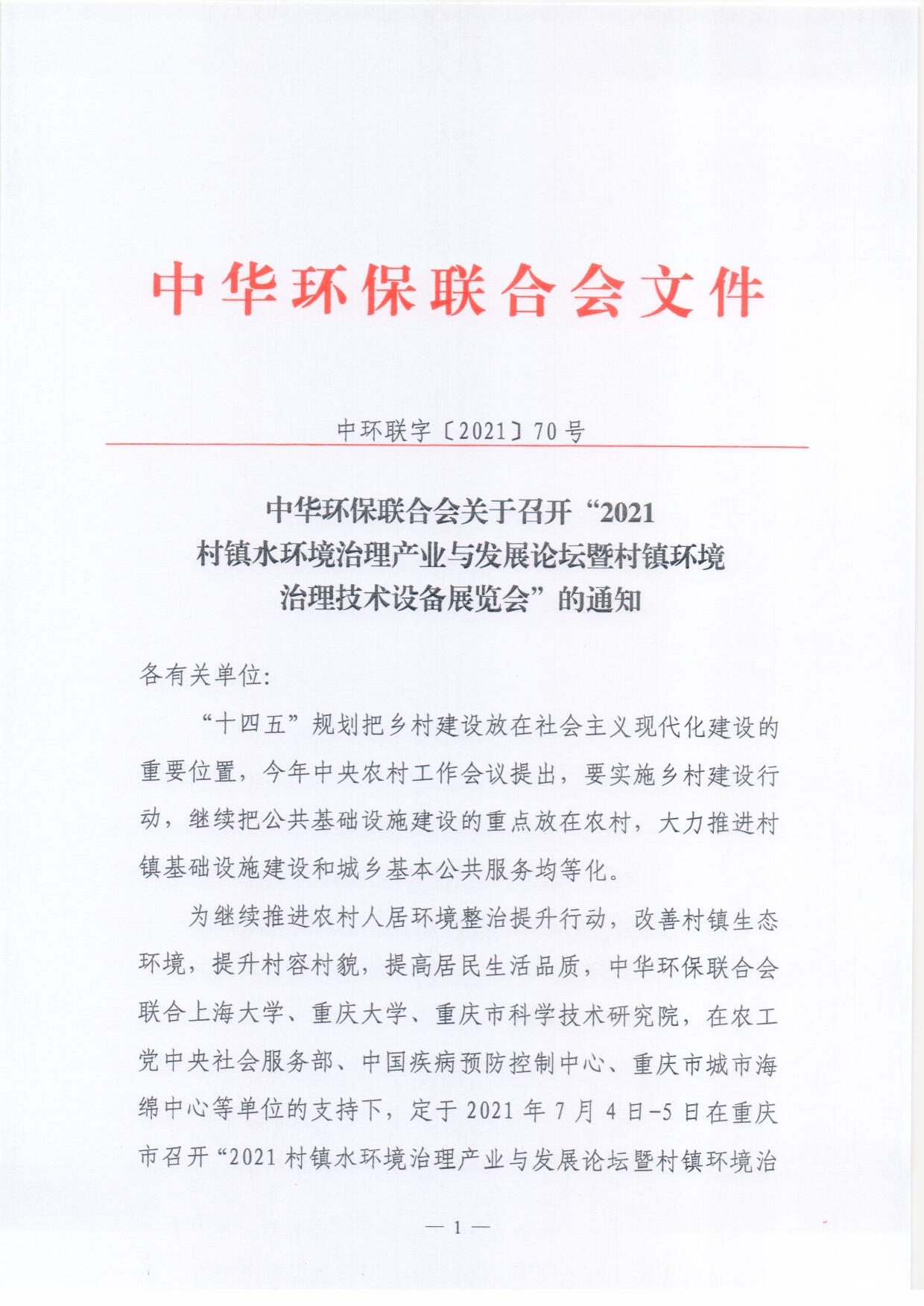 关于召开“2021村镇水环境治理产业与发展论坛暨村镇环境治理技术设备展览会”的通知