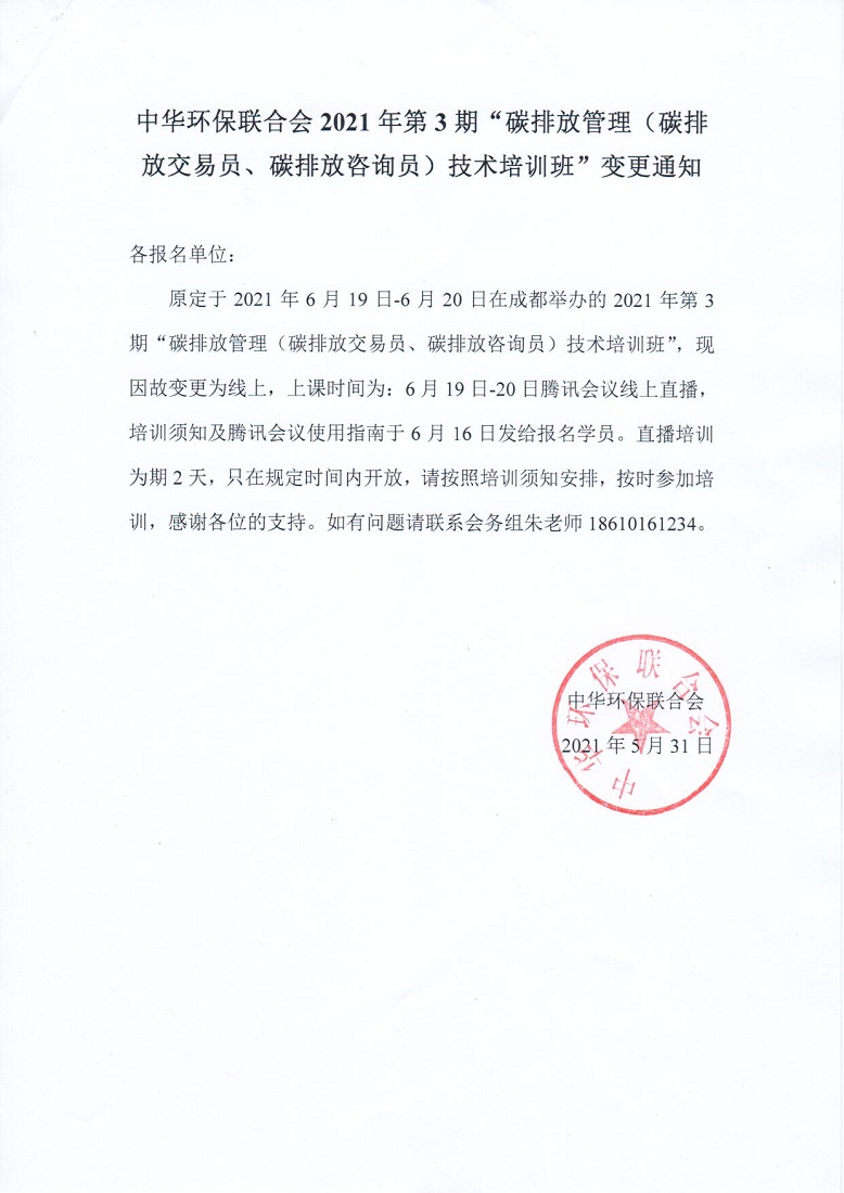 关于2021年第3期“碳排放管理(碳排放交易员、碳排放咨询员)技术培训班”的变更通知