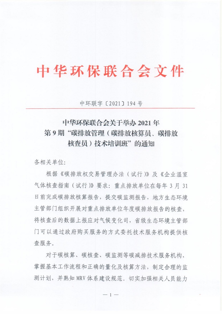 关于举办2021年第9期“碳排放管理(碳排放核算员、碳排放核查员)技术培训班”的通知
