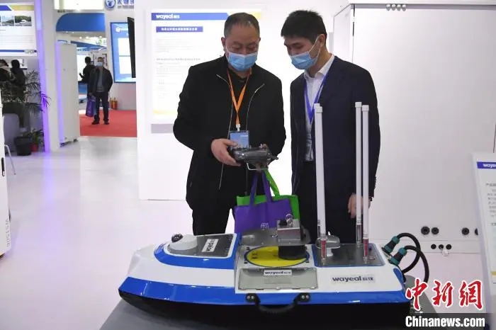 11月26日,安徽合肥,参观者正在了解水质无人自动监测船。 韩苏原 摄