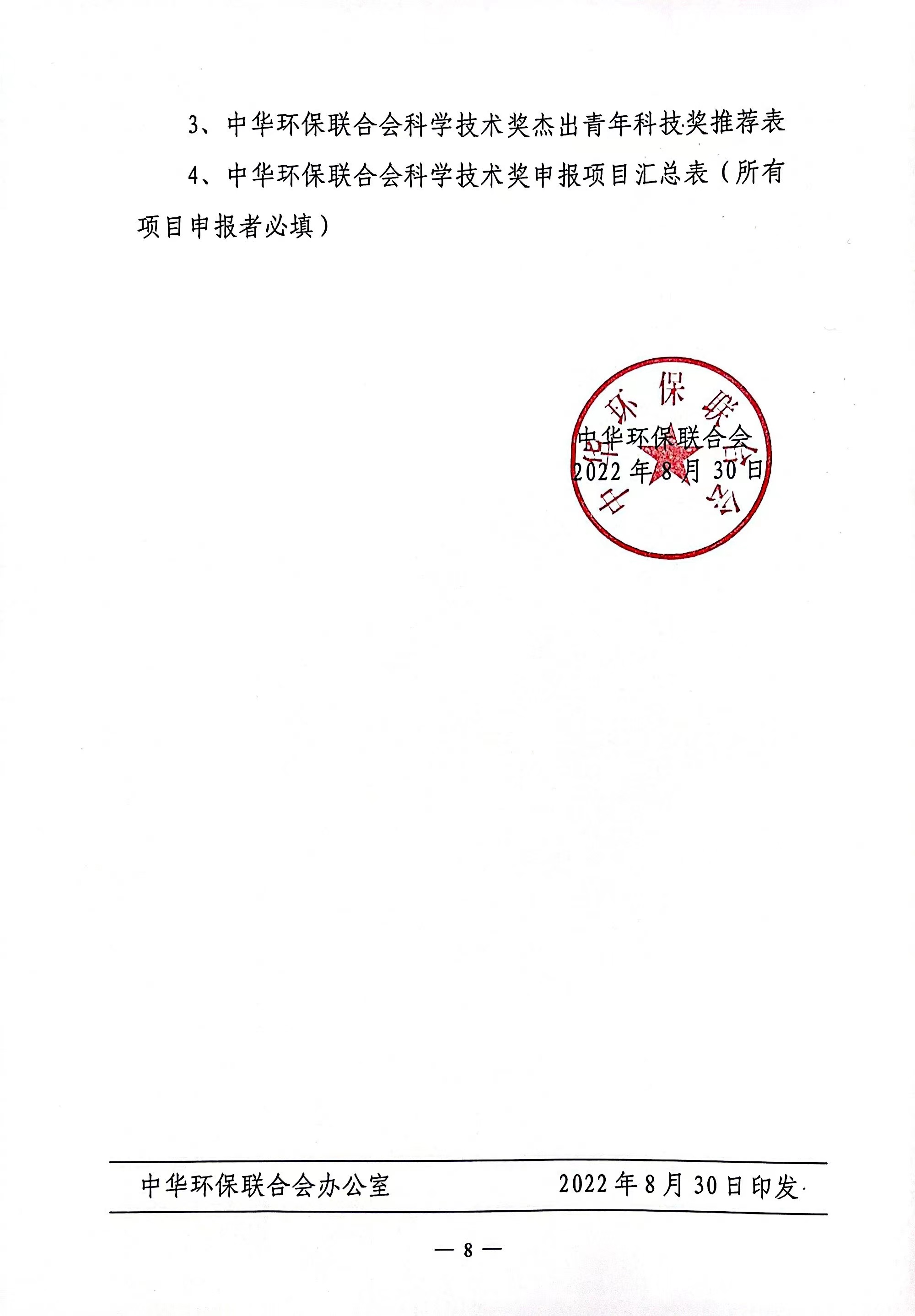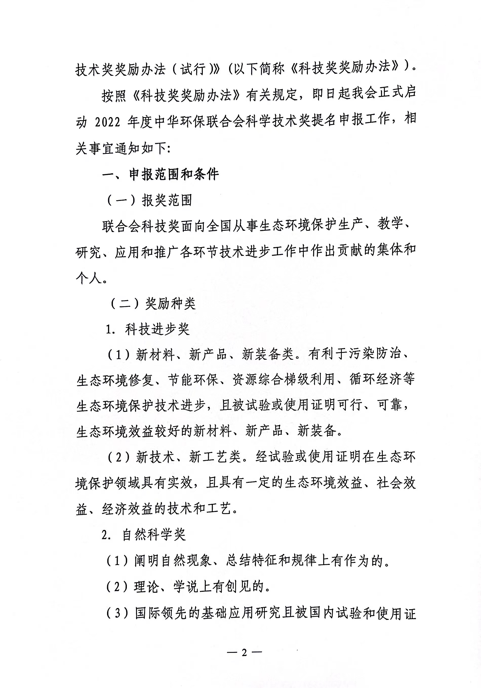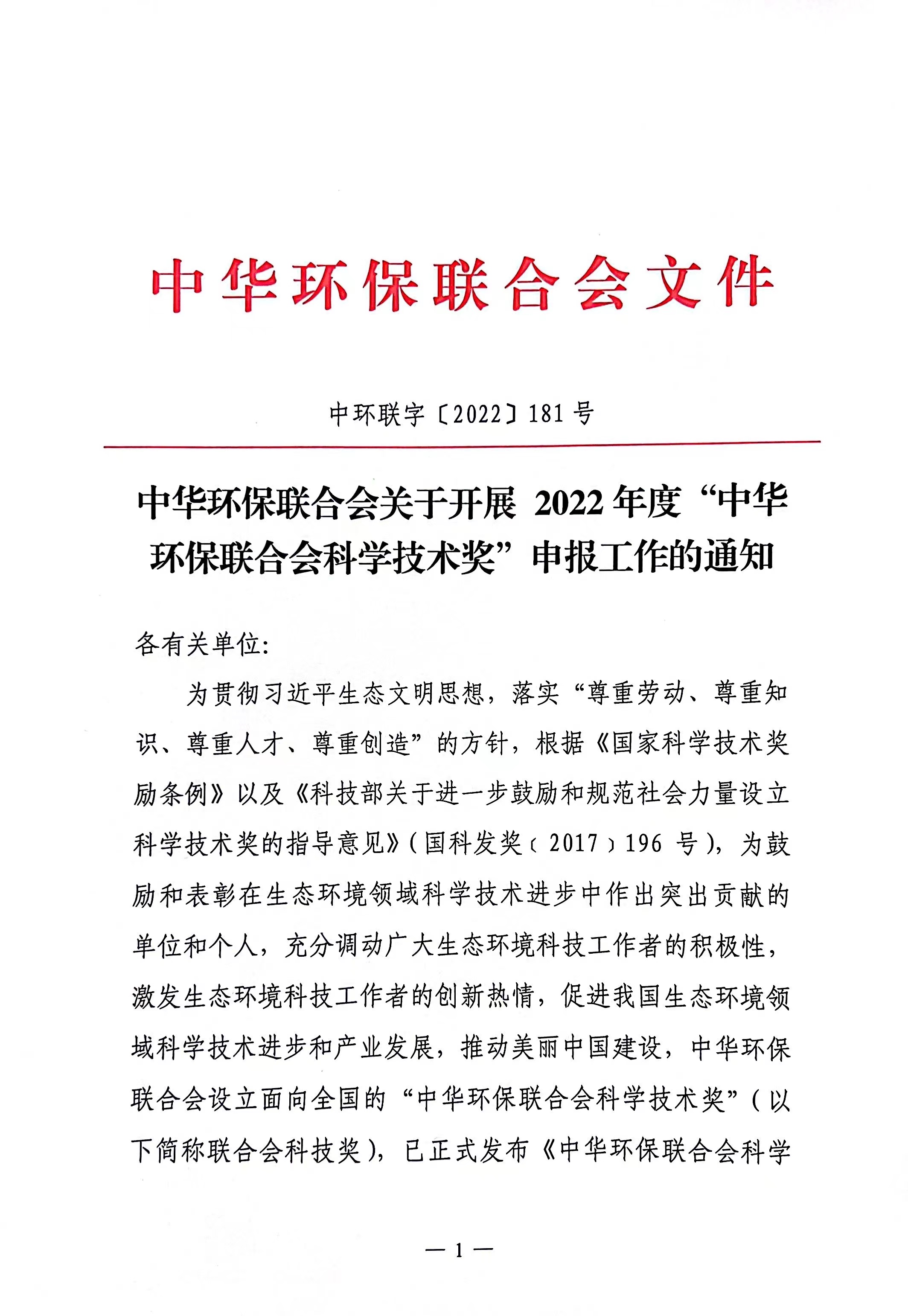 关于开展 2022年度中华环保联合会科学技术奖申报工作的通知