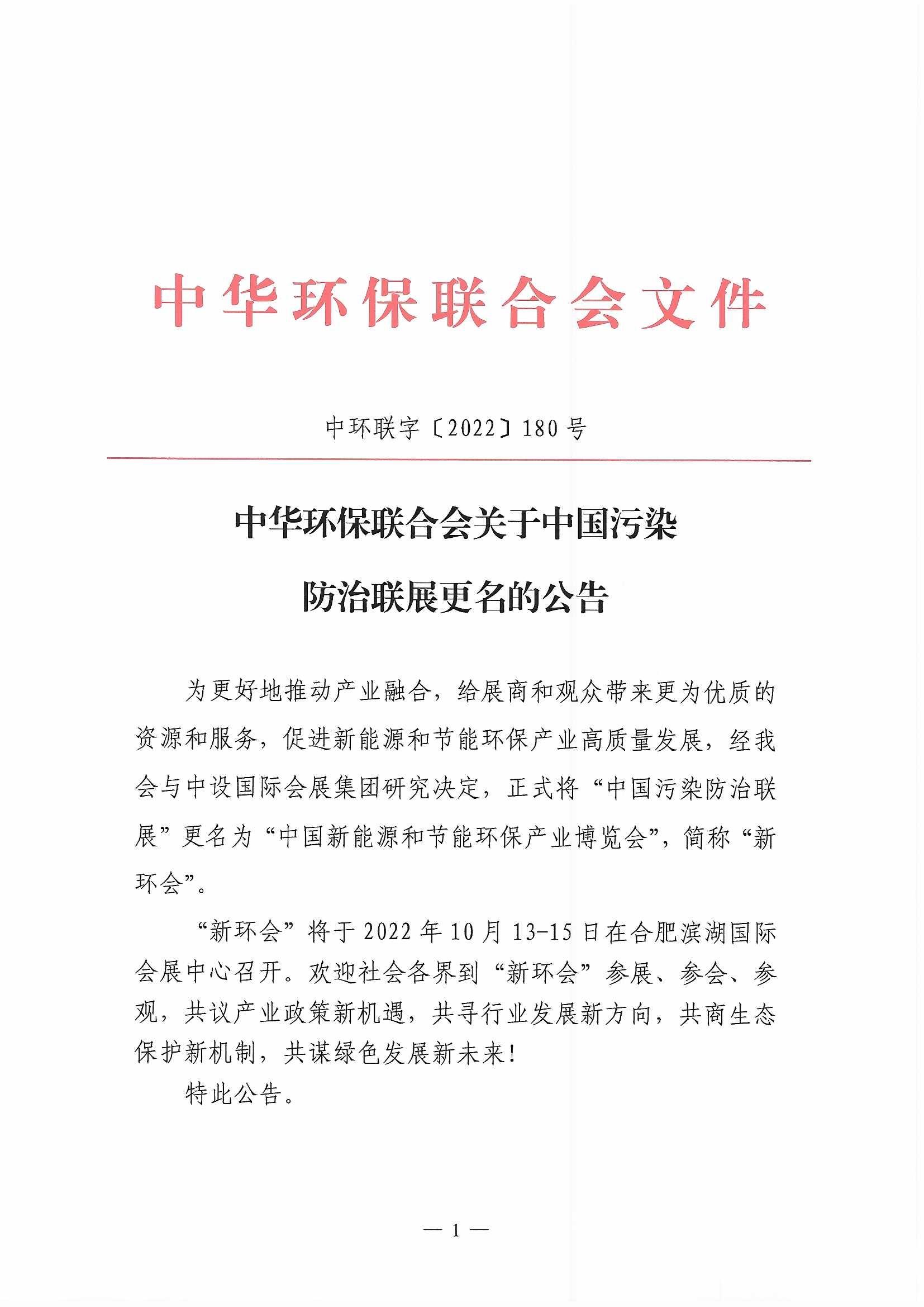 关于中国污染防治联展更名的公告