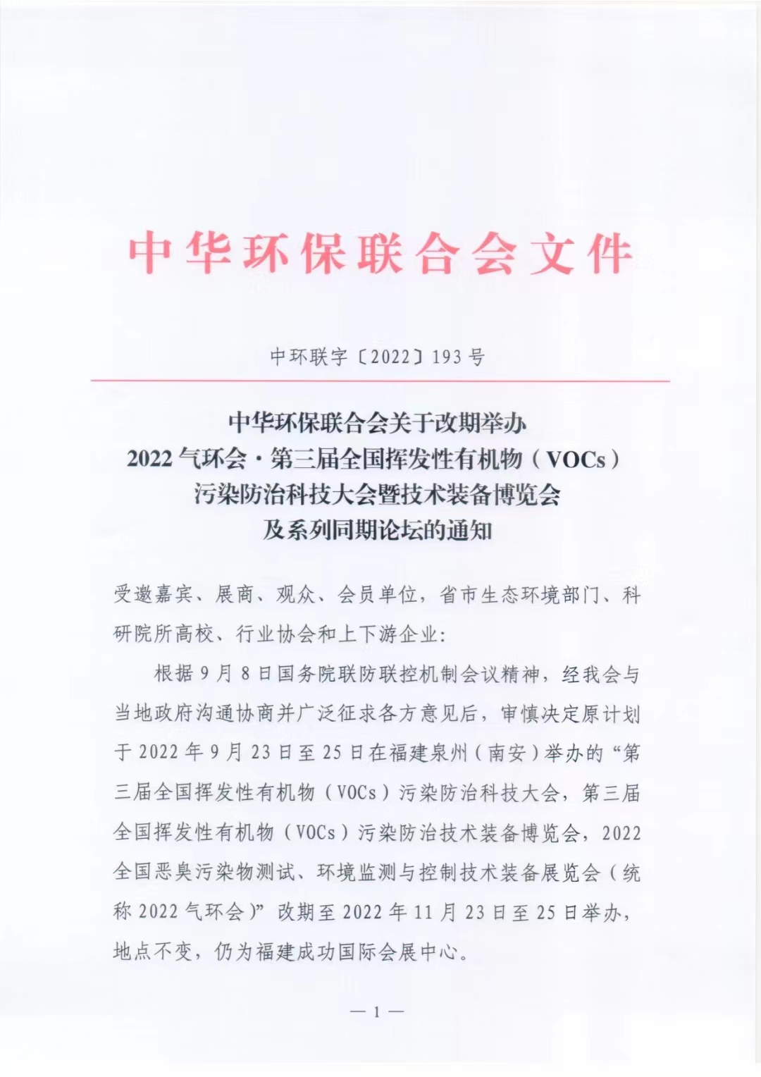 关于改期举办2022气环会·第三届全国挥发性有机物(VOCs)污染防治科技大会暨技术装备博览会及系统同期论坛的通知