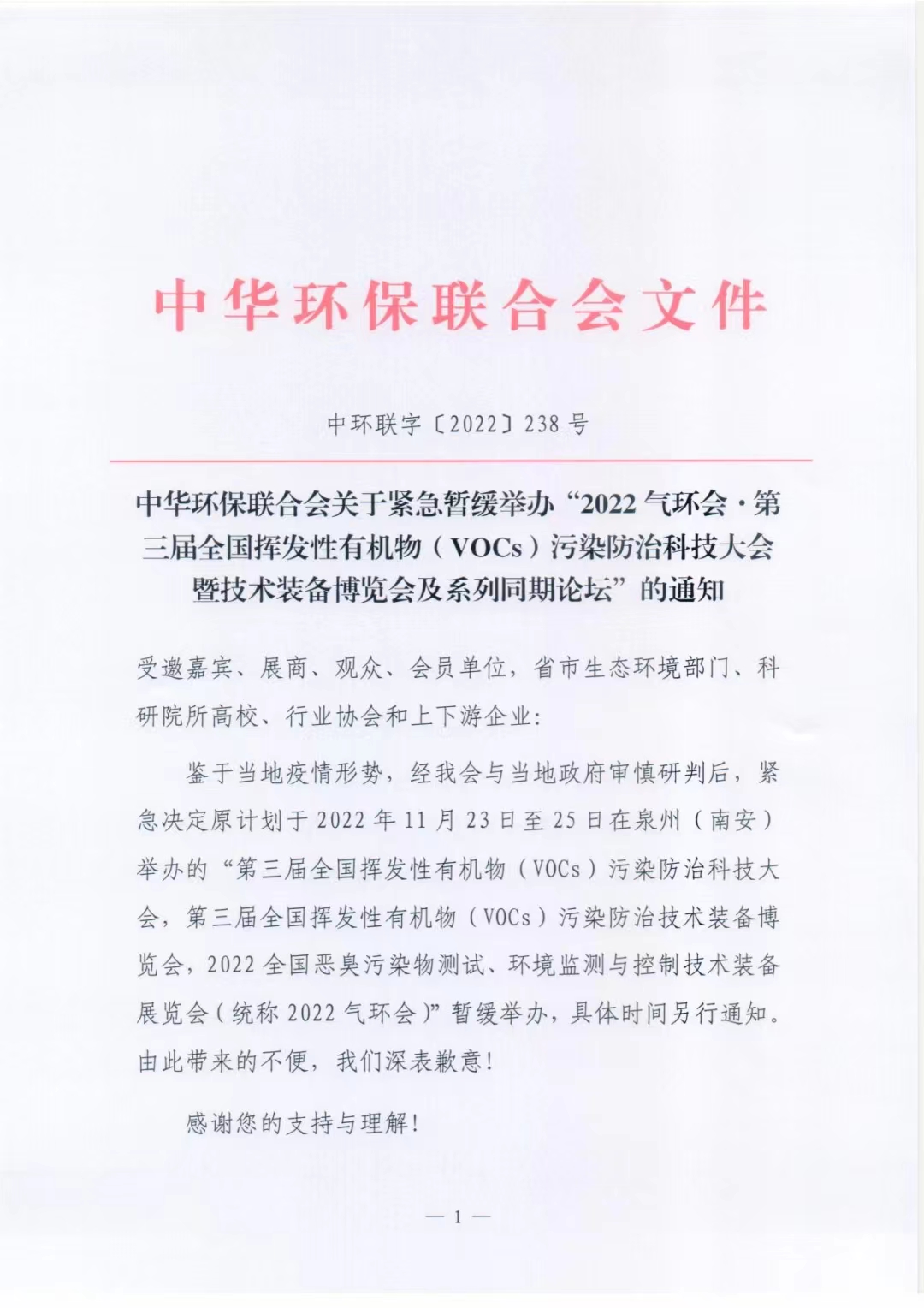 关于紧急暂缓举办“2022气环会·第三届全国挥发性有机物(VOCs)污染防治科技大会暨技术装备博览会及系列同期论坛”的通知