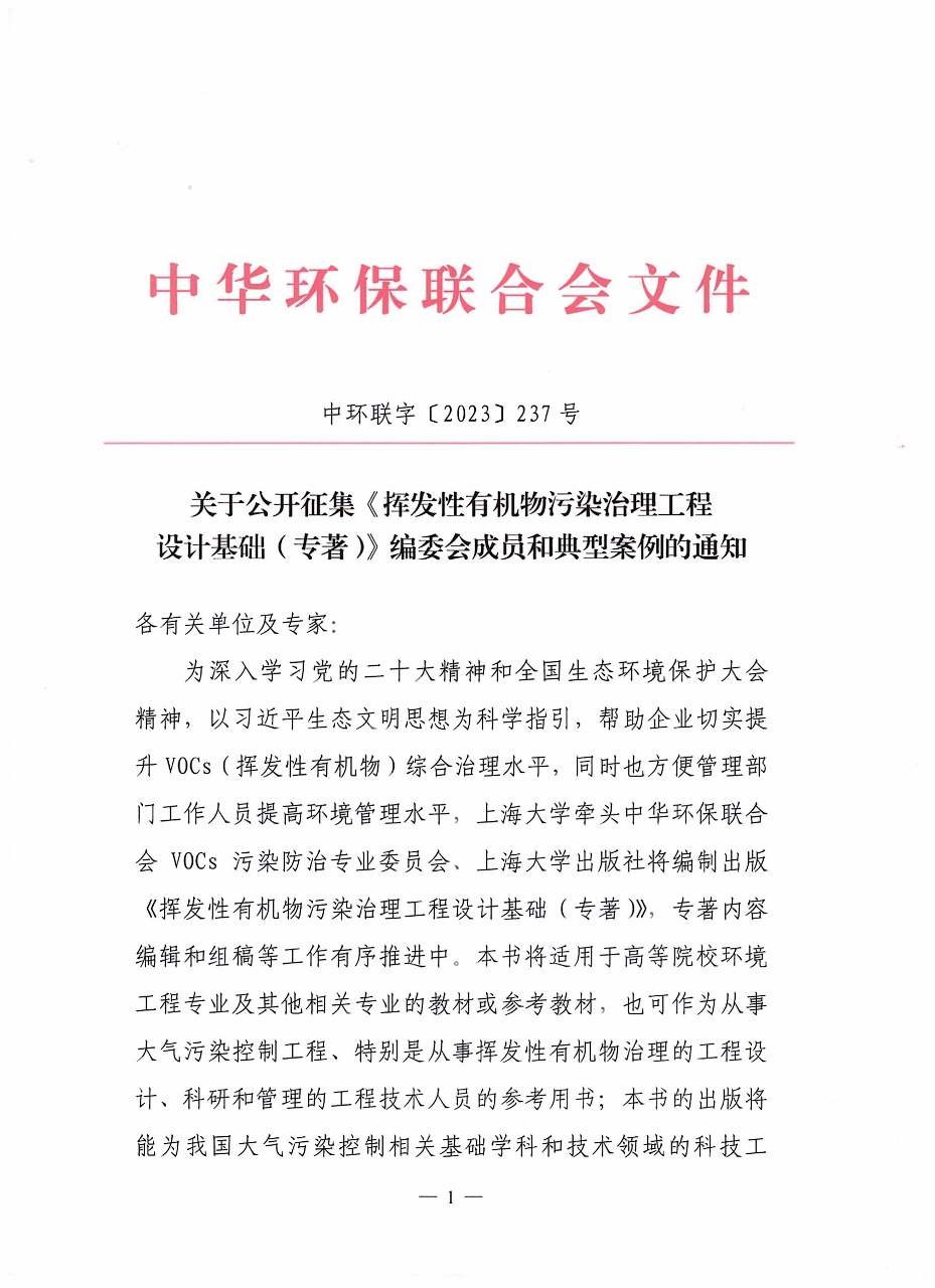 关于公开征集《挥发性有机物污染治理工程设计基础(专著)》编委会成员和典型案例的通知