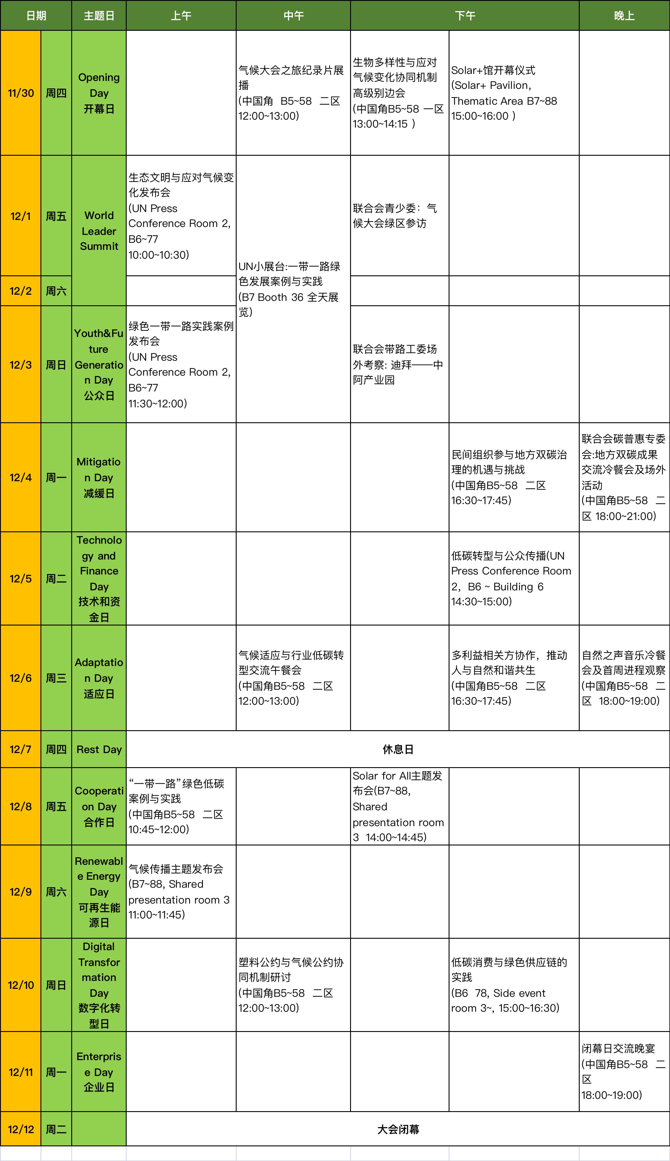 中华环保联合会独立场馆两周活动清单(场馆位置 B7 88, COP28 Blue Zone, Expo City, Dubai. 办公室位置B3 31)
