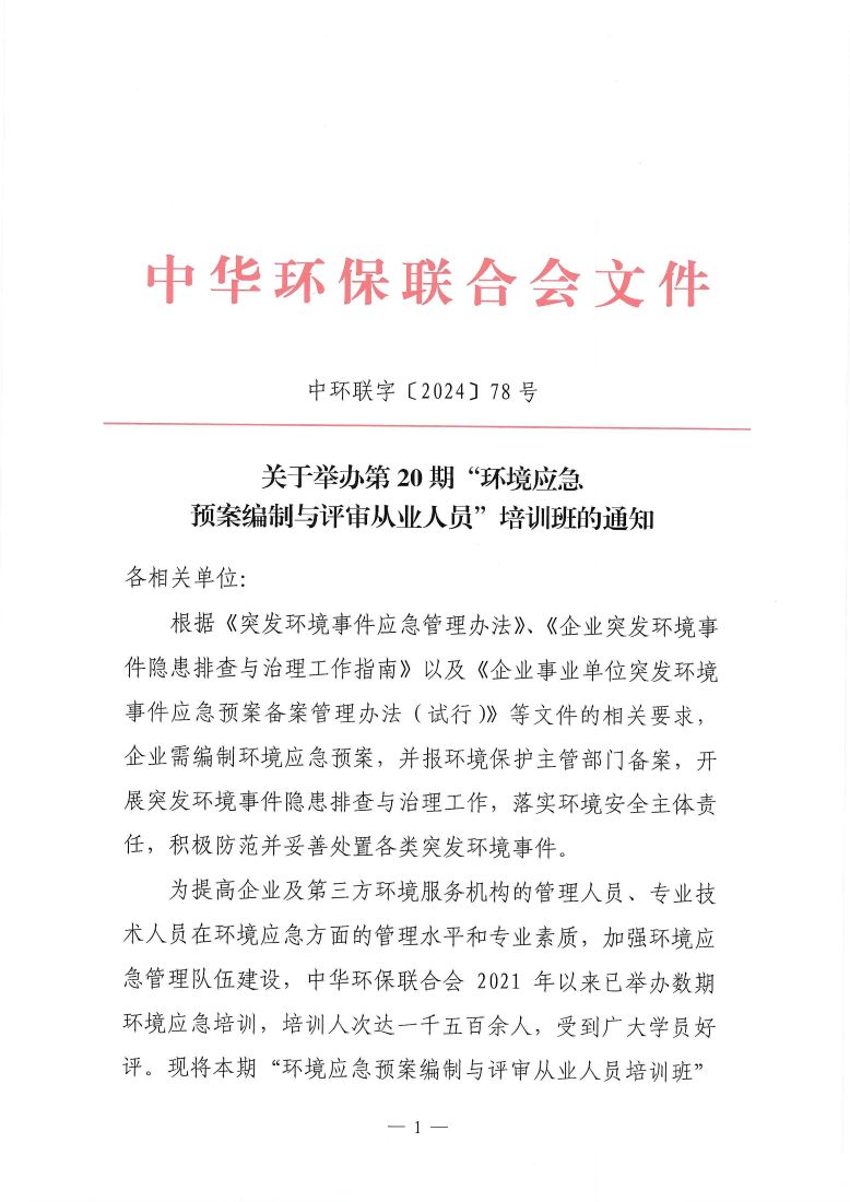 关于举办第20期“环境应急预案编制与 评审从业人员”培训班的通知