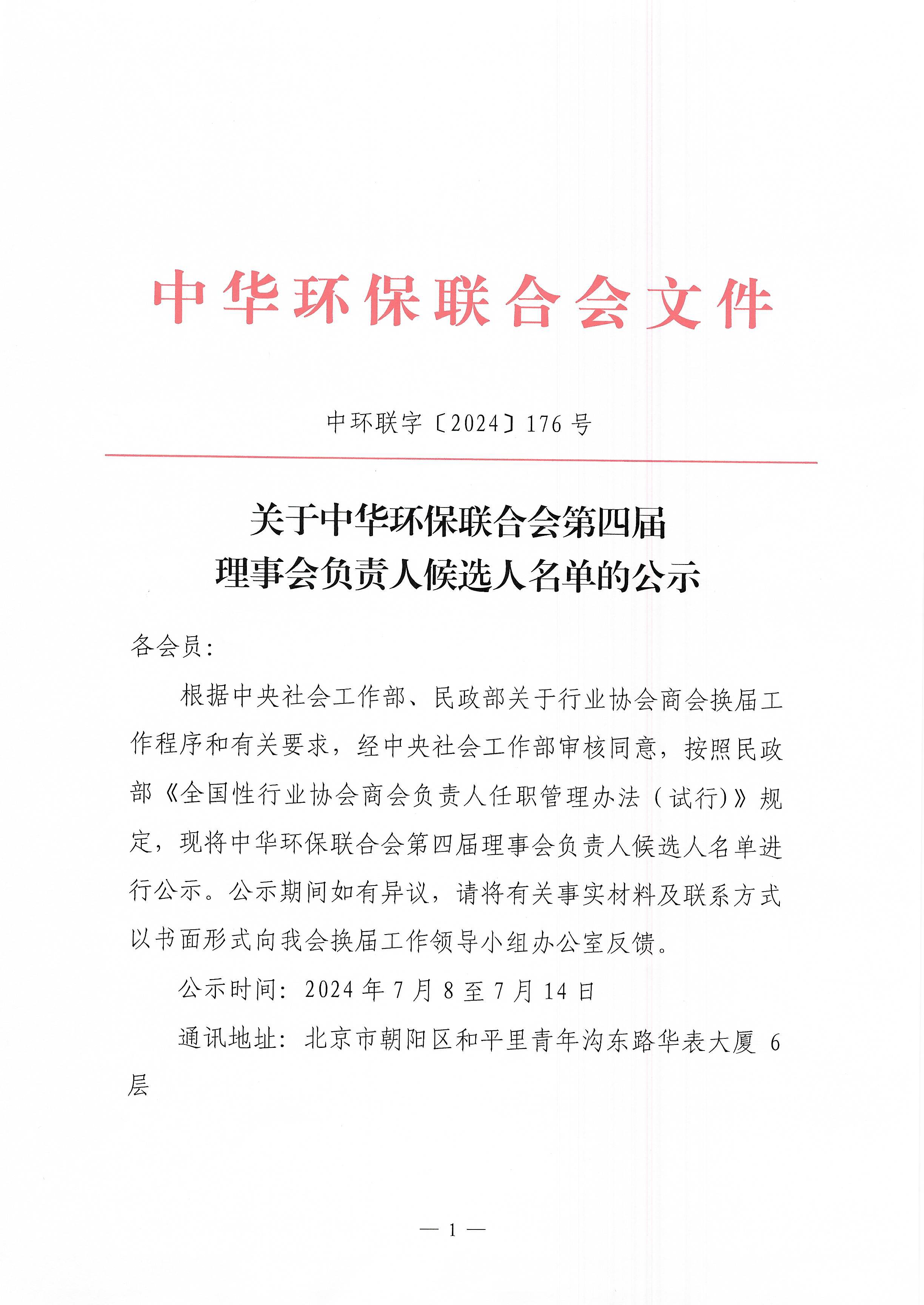 关于中华环保联合会第四届理事会负责人候选人名单的公示