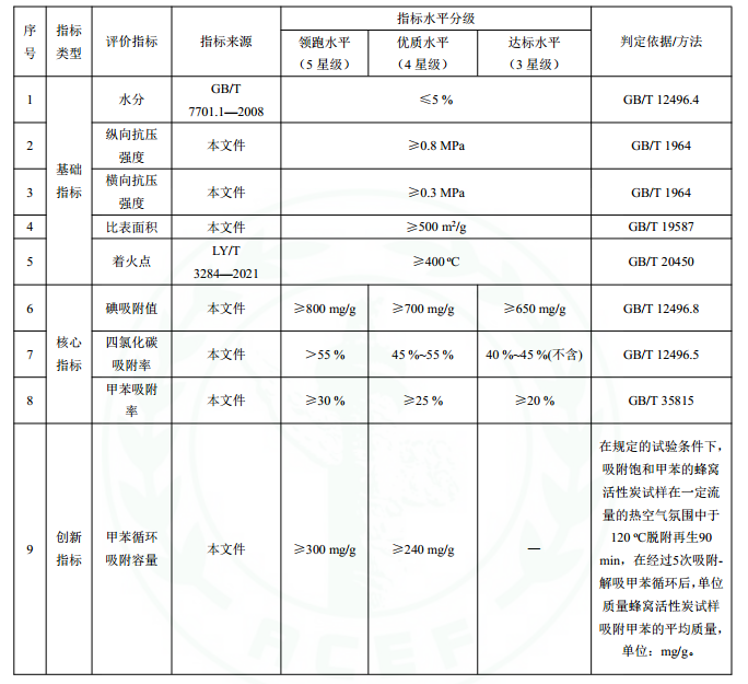 本标准适用于活性炭吸脱附装置专用蜂窝活性炭产品质量分级及企业标准水平评价,为相关机构开展质量分级、企业标准水平评价、“领跑”产品评价及认证提供依据,也可供相关企业在制定企业标准时参考。本标准以相关国家标准和行业规范为基础,规定了活性炭吸脱附装置专用蜂窝活性炭产品质量分级及企业标准水平的基本要求、评价指标、方法及等级划分,对产品质量进行科学分级,提出了具体的评价指标和要求。其中,基础指标包括水分、纵向抗压强度、横向抗压强度、比表面积和着火点;核心指标涵盖碘吸附值、四氯化碳吸附率和甲苯吸附率;此外,还引入创新性指标——甲苯循环吸附容量,以综合评估产品性能。