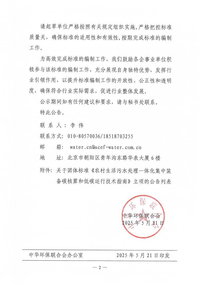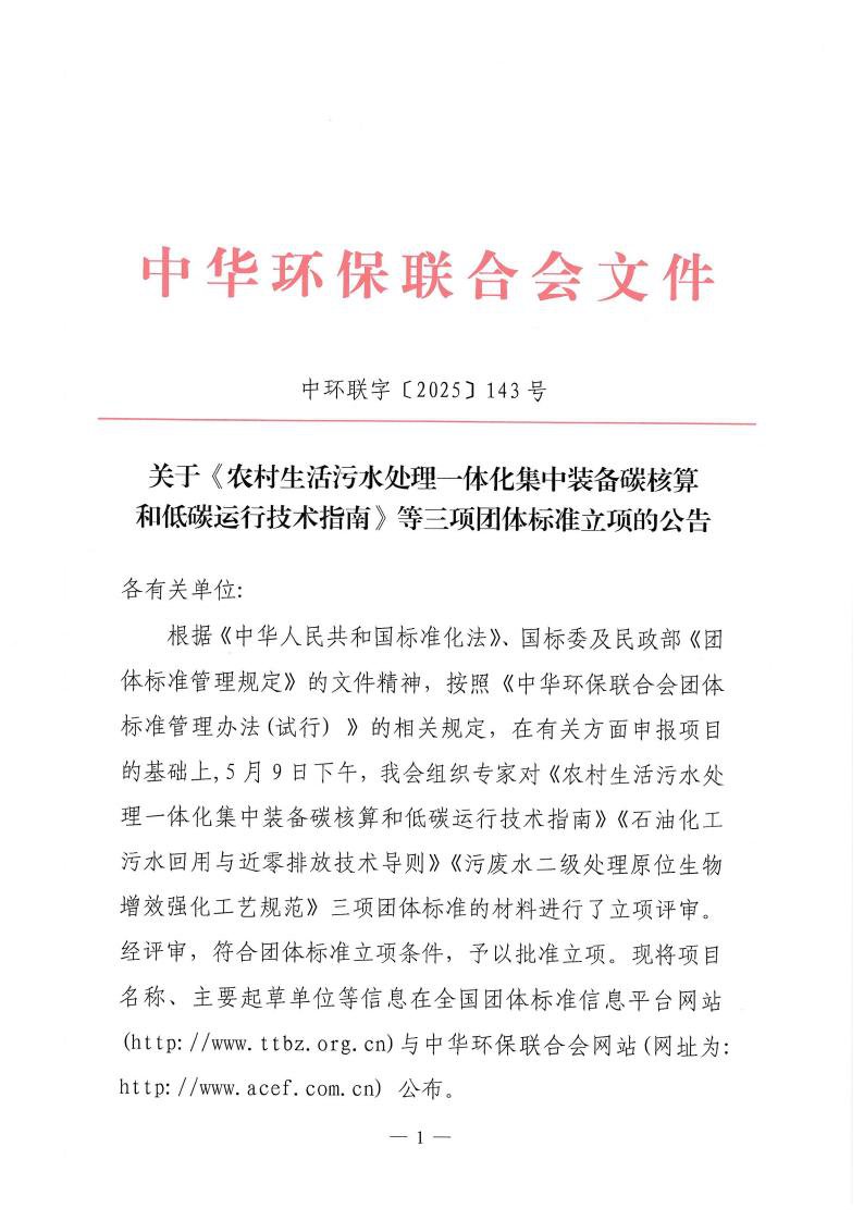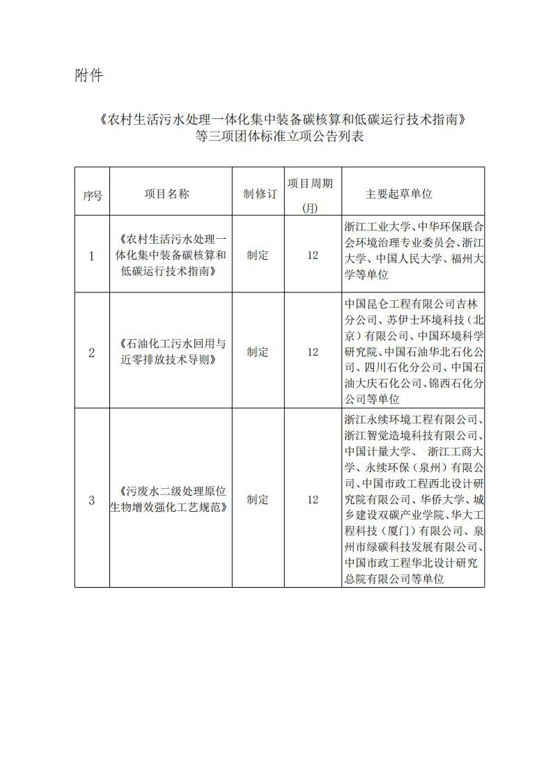 关于《农村生活污水处理一体化集中装备碳核算和低碳运行技术指南》等三项团体标准立项的公告