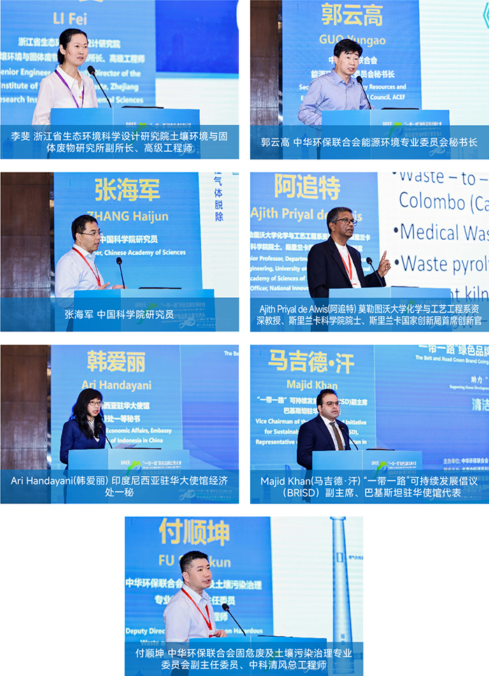 来自浙江省生态环境科学设计研究院土壤环境与固体废物研究所副所长、高级工程师李斐;中华环保联合会能源环境专业委员会秘书长郭云高;中国科学院研究员张海军;莫勒图沃大学化学与工艺工程系资深教授、斯里兰卡科学院院士、斯里兰卡国家创新局首席创新官Ajith Priyal de Alwis(阿追特);印度尼西亚驻华大使馆经济处一秘韩爱丽;巴基斯坦驻华大使馆代表“一带一路”可持续发展倡议(BRISD)副主席马吉德·汗;中科清风总工程师付顺坤7位中外嘉宾分别作主题发言。