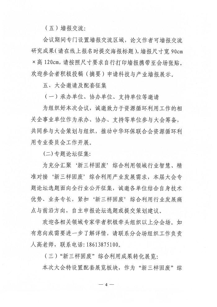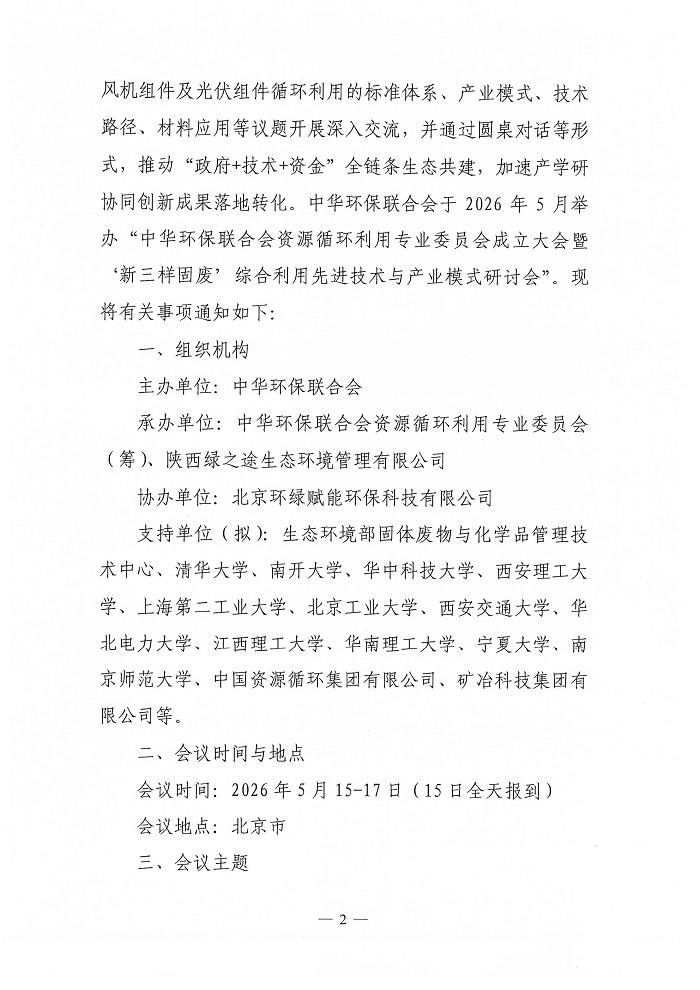 关于中华环保联合会资源循环利用专业委员会成立大会暨“新三样固废”综合利用先进技术与产业模式研讨会的通知(第一轮)