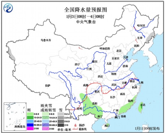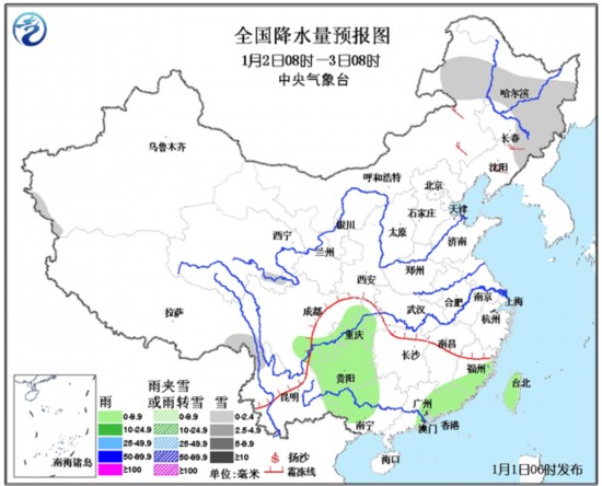 1月1日08时至2日08时,内蒙古东北部、黑龙江、青海东南部等地有小到中雪或阵雪。内蒙古东部、东北地区等地有4~5级风。南海西南部有6~8级的风。