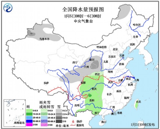 5日08时至6日08时,新疆北部、内蒙古东北部、西北地区东部、川西高原北部等地有小到中雪或雨夹雪;西南地区东部、广西西部、云南南部等地有小雨或阵雨。