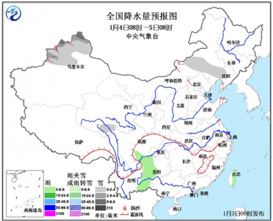 4日08时至5日08时,新疆北部、内蒙古中东部等地的部分地区有小雪或阵雪,其中新疆西北部的部分地区有中到大雪;四川南部、云南东部、贵州西部、台湾等地有小雨或阵雨。新疆西北部、内蒙古中东部、华北北部、山东半岛等地有4~5级风,其中山口地区风力可达8~9级。