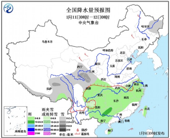 中国气象网讯 据中央气象台预报,10日开始,长江中下游及其以南地区自西向东将会出现一次降水过程。大部地区以小到中雨为主,其中,贵州西部、江淮等地的部分地区将有雨夹雪,青藏高原中东部、西北地区东南部等地有小到中雪。