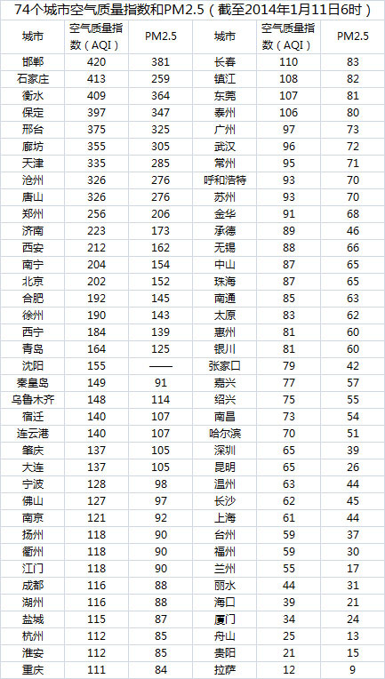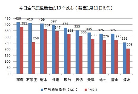 人民网北京1月11日(记者 蒋琪)截至今日早上6时,邯郸的AQI(空气质量指数)达到420,属于六级严重污染,成为74个公布PM2.5数据城市中空气质量最差的城市。今日空气质量最差的10个城市分别是邯郸、石家庄、衡水、保定、邢台、廊坊、天津、沧州、唐山、郑州。其中邯郸、石家庄、衡水、保定、邢台、廊坊、沧州、唐山8个城市属于河北省。