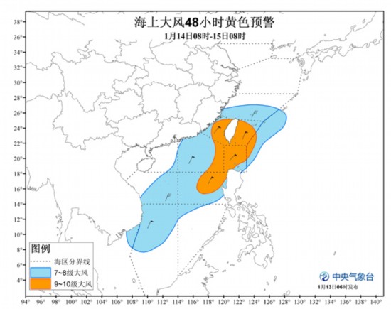 另外,受南下的冷空气影响,近日海上天气不太平静。中央气象台今晨6时继续发布海上大风黄色预警:预计,14日8时至15日8时,台湾海峡、台湾以东洋面、巴士海峡、南海中东部海域将有9级、阵风10~11级的东北风,东海南部海域、南海东北部海域、南海中西部和西南部海域将有7~8级、阵风9~10级的东北风。