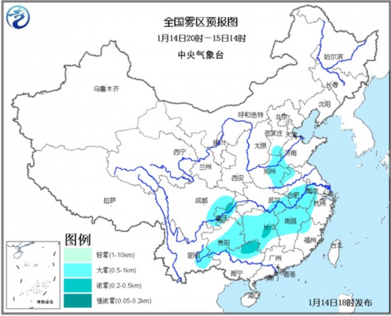 由于在东移入海的变性高压控制下,中东部地区静稳天气形势持续,因此雾和霾天气还将继续发展。中央气象台今日18时继续发布大雾黄色预警:预计,今天夜间到明天上午,四川盆地东部、重庆中西部、贵州大部、云南东部、河南东部、安徽大部、江西大部、湖南、广西北部、福建西北部等地有大雾,其中,湖南中部、重庆西部、广西北部等地的部分地区有能见度不足500米的浓雾。