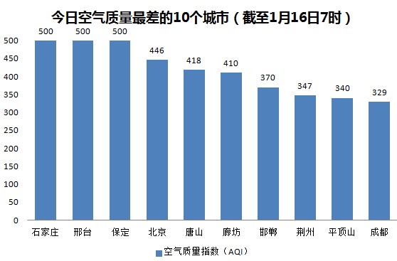 人民网北京1月16日电 (杨翼)根据环保部公布的最新数据,截至今天早上7时,石家庄、邢台和保定的AQI(空气质量指数)“爆表”达到最高值500,属于六级严重污染,其中石家庄PM2.5数值达到了569,成为161个参与空气质量排名的城市中空气质量最差的城市。今日空气质量最差的10个城市分别是石家庄、邢台、保定、北京、唐山、廊坊、邯郸、荆州、平顶山和成都。其中石家庄、邢台、保定、唐山、廊坊、邯郸属等6个城市属于河北省。北京排在第四位,AQI指数为446,属于六级严重污染。
