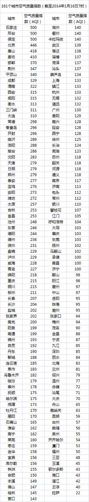 说明:自2014年1月1日起,环保部发布空气质量实时信息、空气质量月报及参与空气质量排名的地级城市已由74个增加到161个,包含了直辖市、省会城市、计划单列市、“三区”所有地级城市、环保重点城市和环保模范城市。人民网环保频道将采用环保部的官方数据,对161个城市每日空气质量进行排行。