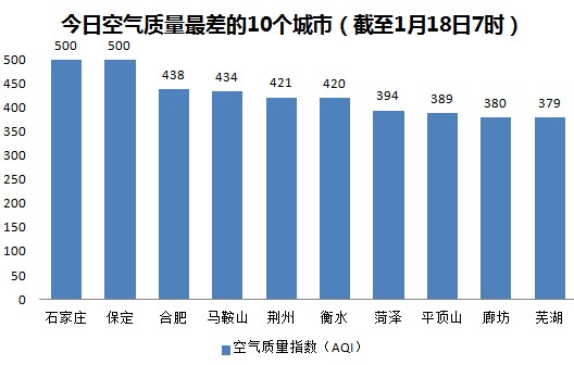 人民网北京1月18日电 (杨翼)根据环保部公布的最新数据,截至今天早上7时,石家庄、保定的AQI(空气质量指数)“爆表”达到最高值500,属于六级严重污染,成为161个参与空气质量排名的城市中空气质量最差的城市。今日空气质量最差的10个城市分别是石家庄、保定、合肥、马鞍山、荆州、衡水、菏泽、平顶山、廊坊和芜湖。其中安徽参与排行的3个城市(合肥、马鞍山、芜湖)都进入最差10名。