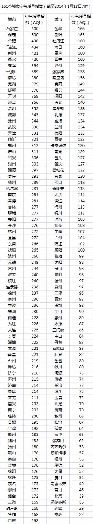 说明:自2014年1月1日起,环保部发布空气质量实时信息、空气质量月报及参与空气质量排名的地级城市已由74个增加到161个,包含了直辖市、省会城市、计划单列市、“三区”所有地级城市、环保重点城市和环保模范城市。人民网环保频道将采用环保部的官方数据,对161个城市每日空气质量进行排行。