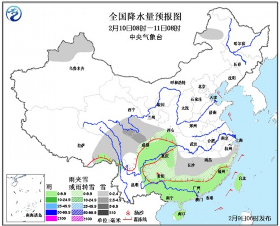 中国气象网讯 9~11日,南方地区多雨雪天气,气温偏低。江汉、江南大部、贵州等地将有雨夹雪或雪,其中,湖南中部、江西中部、浙江中部偏南地区的部分地区有大雪,局地暴雪(10~12毫米),上述地区积雪深度有5~8厘米,部分地区将出现道路结冰;另外,贵州中部、湖南西北部、江西南部等地的部分地区有冻雨;四川盆地、华南等地有小到中雨,局部地区大雨。