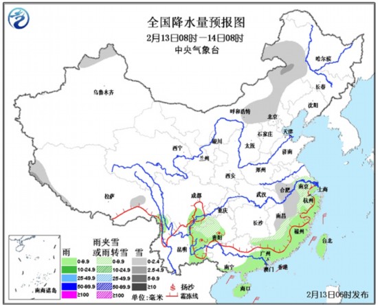 13日08时至14日08时,新疆西北部、西藏西南部、内蒙古东部、华北北部、贵州北部、安徽中南部、江西东部、浙江西部等地的部分地区有小到中雪或雨夹雪;四川盆地东南部、贵州南部、云南东部、广东、福建等地有小雨,贵州南部局地有冻雨。东海东北部和南部、台湾海峡有7~8级、阵风9级的东北风。