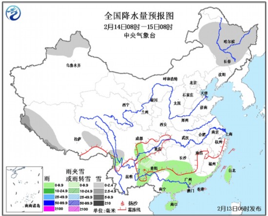 14日08时至15日08时,新疆北部、西藏西南部、内蒙古东部、黑龙江大部等地有小到中雪,其中,西藏西南部的部分地区有大到暴雪;湖南南部、华南中东部、贵州西部、云南东部等地有小雨(或雨夹雪),其中,贵州西南部的部分地区有冻雨。东海东北部和南部、台湾海峡有7~8级、阵风9级的东北风。