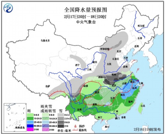 今天白天,青藏高原及其以东的雨雪已逐渐展开攻势,陕西中部、甘肃中南部、宁夏南部、青海东部及新疆伊犁河谷等地均出现降雪或雨夹雪天气,局地降雪量达到暴雪量级。同时,江淮、江南、华南北部等部分地区的降雨也已拉开序幕,以小到中雨为主。