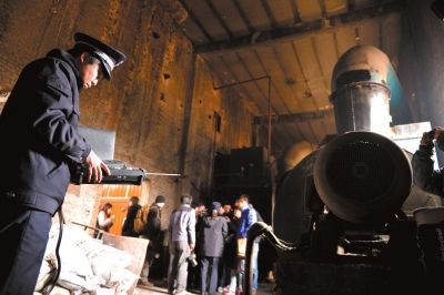 昨天,执法人员在平谷一处锅炉房内通过机器检测环境相关数值是否超标。京华时报记者王苡萱摄