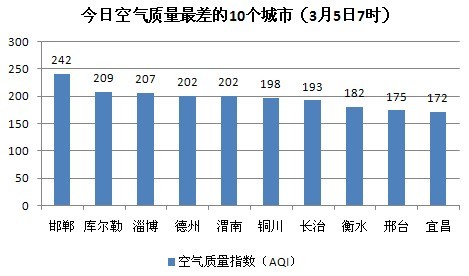 人民网北京3月6日电 (蒋琪)根据环保部公布的最新数据,截至今天早上7时,邯郸的AQI(空气质量指数)达到242,属于重度污染,成为161个参与空气质量排名的城市中空气质量最差的城市。今日空气质量最差的10个城市分别是邯郸、库尔勒、淄博、德州、渭南、铜川、长治、衡水、邢台、宜昌。其中邯郸、衡水、邢台等3个城市属于河北省。渭南和铜川属于陕西省。