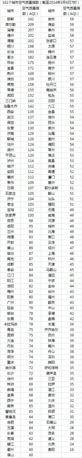 说明:自2014年1月1日起,环保部发布空气质量实时信息、空气质量月报及参与空气质量排名的地级城市已由74个增加到161个,包含了直辖市、省会城市、计划单列市、“三区”所有地级城市、环保重点城市和环保模范城市。人民网环保频道将采用环保部的官方数据,对161个城市每日空气质量进行排行。